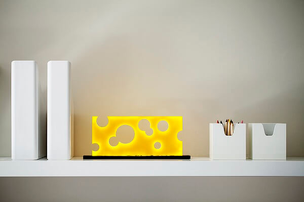 In this photo a light went through the cheese and enhanced its characteristic color. This led to the design of the first lamp in the series named SWEEZ. I guess you can all guess where this name comes from. The lamp is designed in such a way that the light travel within and is being defused in selected locations. Using specific materials and techniques, led to the results you see here.